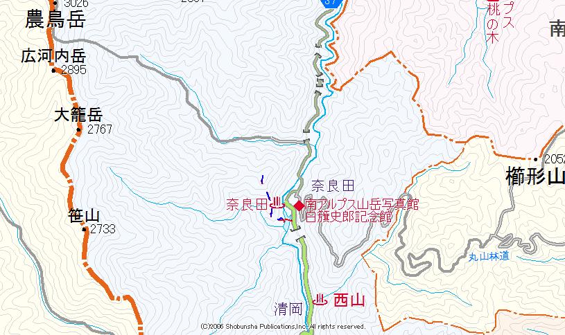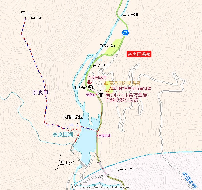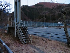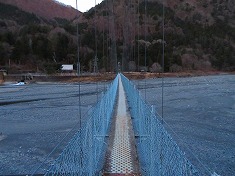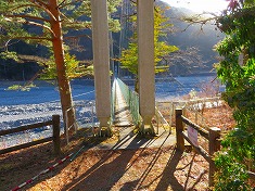 | 笹山に行くようにして奈良田湖を吊り橋で渡る。 | 吊り橋はしっかりとして揺れは少ない。 | A右岸の八幡社公園。南西へ進む。 | 公園内を発電施設側に向かうと、山手に登路が見える。ステップが切られた発電所の巡視路。 |