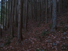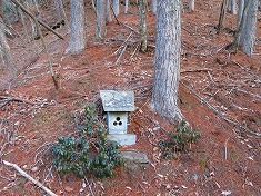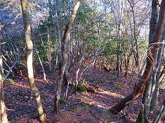 | B尾根に乗り上げた場所に祠がある。 | 1050m付近のなだらか地形。 | 熊棚も見られる。 | 林業作業の名残も |