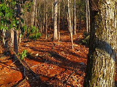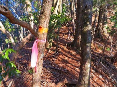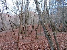 | やせ尾根を通過 | 来光を背に・・・。中盤以降で道形は薄くなる。 | 中盤以降で、これらマーキングがちらほらと見られる。 | 山頂大地の南に乗り上げる。1450m付近。 |