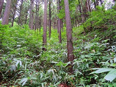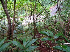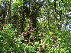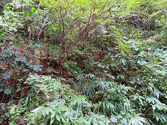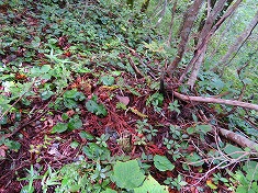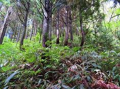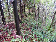 西に進んで行くとやや植生の少ない崖地形がある。上まで7mくらいは在ろうか、簡単な場所ではないが周囲の中では一番登り易そうな場所であった。野草を掴みながら、ズリ落ちる足を踏ん張りながら登って行く。登り上げるとその先は小さな谷地形で、東側に小尾根が通っていた。常に植生の少ない場所を選ぶようにして小尾根に乗る。この尾根は急峻だが上部の植生は薄かった。檜が見えるので植林斜面のようだが、管理されなくなっているようにも見える。