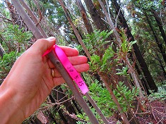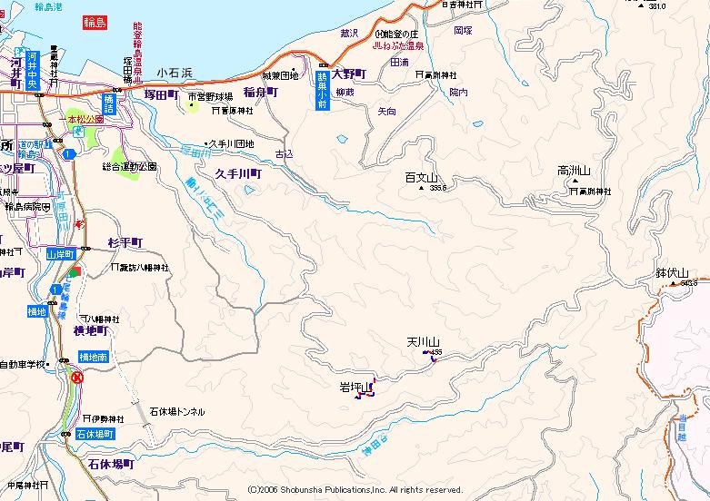 天川山には、岩坪山にあったのと同じリボンが下がっていた。岩坪山では気づかなかったが、ここからは木々の間から青く日本海が見え、防波堤が白く輪島港が見えていた。山頂部には伐採痕があり、道形が西側へと進んでいた。これに対しては植林作業用の道って解釈が正しいのだろう。下山は往路を伝う。