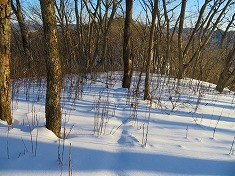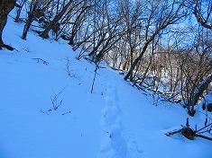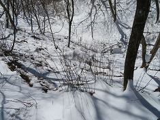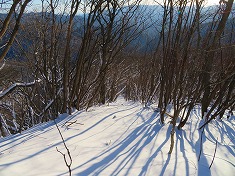 横見山の北側は急峻で降りられず、西に戻って、先ほどのマーキングの場所から北東にトラバースするように降りてゆく。ここは雪は深く柔らかく、復路は苦労するように思いつつ降りていた。北に進む広い尾根に乗ると、笹枯れの風景があった。繁茂している時は分けながら進まねばならなかったようだが、笹枯れで楽に進ませてもらう。鹿が伝うのだろう、雪の上にはくぼみがレールのように続き、その上に新雪が乗っていた。