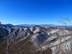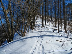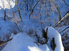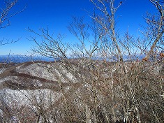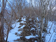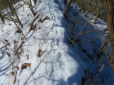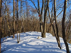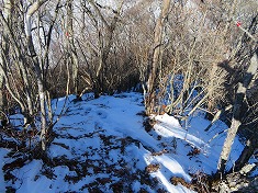 右の耳に戻ると、前橋ハイキングクラブの標識が見られた。同化した色をしており往路には気づかなかったようだ。さてこの先には核心部のリッジがある。自分のトレースが在るので辿ればいいのだが、崩れ落ちる可能性が終始伴う。往路同様に抜き足差し足で抜けてゆく。落ちるにしても上州側に落ちようと思いつつ・・・。危険個所を抜けたら南に向かい1190m峰に達したら、その先の1210m峰を経由し直線的に左の耳を端折って西に向かう。雪が消えるとやや野草が茂る場所となるか、枯れたそれらが多くみられる場所もあった。左の耳の南西で往路のトレースに乗る。