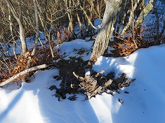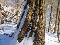 | E四等点 | E榊山から小唐沢山を望む。一帯の地形は複雑。 | 左の耳の南斜面。灌木には刃跡が残る場所が多い。1210m峰から北に進んでしまいルートミスで引き返す。 | 直径が2mほどある大きなナラ。 |
