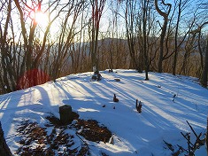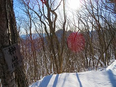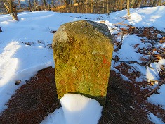 尾根に登り上げた場所には、マーキングが二色でフラれ、そのうちの青色は北側に降りて行っていた。東に尾根を進み横見山に到着する。三角点がちょこんと雪から顔を出し、その西側に古風な石柱が立っていた。三市町村の境としてものか、雪を詰めて彫られた字を判読するも、その文言からコレと判ることが無かった。山名表示があるかと思ったが無く、休猟区の看板のみ見えた。余地峠側の尾根には一筋の切り拓きが降りており伝えるようであった。