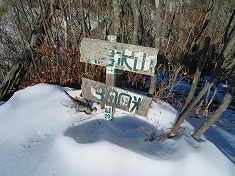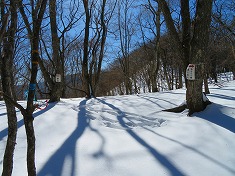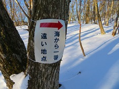 南進してゆくと、木製の榊山への道標も見られた。これも往路に目に入らなかった。そして1230m地点の「海から一番遠い場所」の道標の分岐に戻る。その場所が気になったが、示す方向が谷を下った先のようなのでまたの機会とする。遠く銃声が響いてきていた。腕のいい猟師が居るのか、単発で仕留めたのか連続する音ではなかった。南に我がトレースを追って戻って行く。