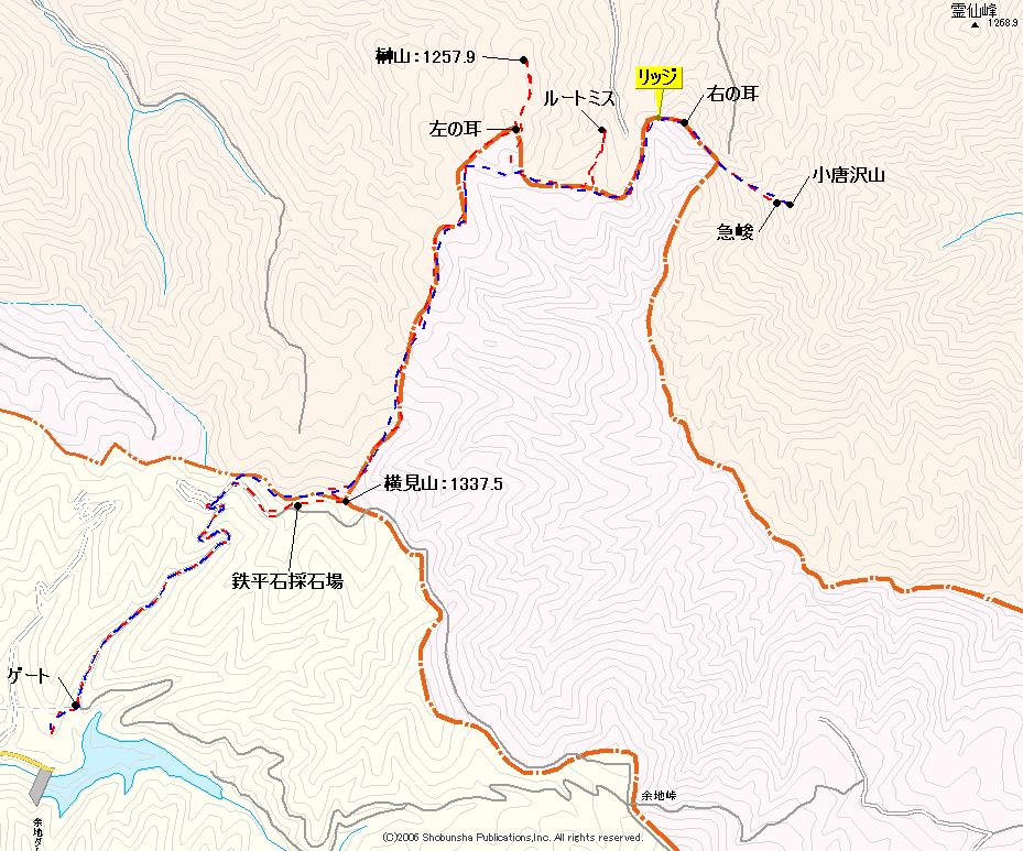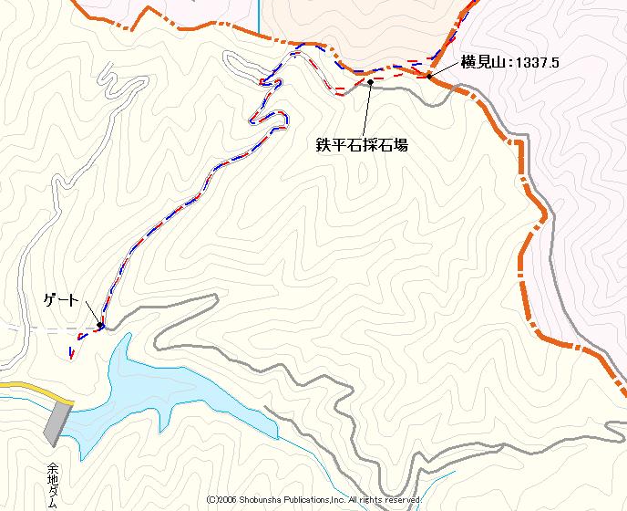 @余地ダム6:29→(3M)→A林道入口(ゲート)6:32〜36→(44M)→B採石場7:20→(14M)→C横見山7:34〜37→(43M)→D左の耳8:20→(8M)→E榊山8:28〜29→(43M:ルートミスを含む)→F右の耳9:12→(38M)→G小唐沢山9:50〜10:00→(34M)→H右の耳帰り10:34→(90M)→I横見山西鞍部12:04→(14M)→J採石場西側の峠12:18→(21M)→K林道入口帰り(県道108号出合)12:39〜41→(2M)→L余地ダム12:43