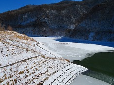 | L余地ダムに到着 | Lダム湖は全面結氷はしていなかった。 |