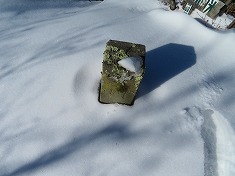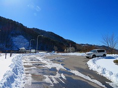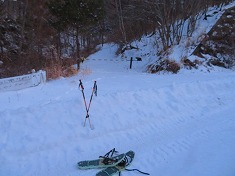 降りた場所は峠のようになっていて、道形が尾根を乗越していた。南に降りると古いコンプレッサーが見られた。そして往路に見たゲートの場所で林道に乗る。快晴の日差しを浴びながら林道を闊歩しながら降りてゆく。鉄平石があるくらいで鉄分が多いのか、流れがある場所では、さび色の水が流れていた。県道108号に出合い、ゲートの場所でスノーシューを脱ぐ。わずかに歩き余地ダムに帰還。ここが除雪されていて助かった。県道が除雪されていることから、その両側に雪の壁が造られていて、駐車場が除雪されてなかったら、停めるにも難儀した場所だった。