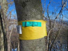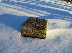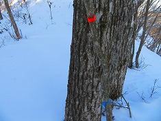 | B採石場の東側にも小屋が見られる。破線路の道形は雪のため判らず。 | 横見山西側の鞍部に乗り上げる。青いマーキングは北に降りている。 | C横見山。最高所に角材での標柱が立っている。 | C三等点 |