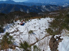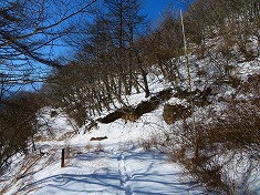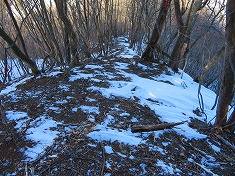 | 痩せ尾根の帰り。 | 痩せ尾根の北(信州)側は、ほぼ垂直に15mほど切れ落ちている。 | 痩せ尾根の南(上州)側。こちらは勾配があるが、谷の緩斜面までは15mほどある。 | 「海から・・・」と「榊山」の道標の場所帰り。 |