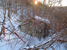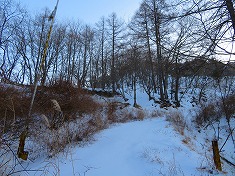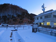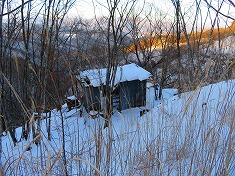 深夜の余地ダムは、堰堤上のスライドゲート小屋が明るくトイレでも在るかのように光っていた。ここは冬季はトイレは開放しておらず封鎖中であった。シュラフに潜り込み夜明けを待つ。ここでの外気温はマイナス12℃であった。空の星が降るように見えていた。暖かかった車内が、だんだんと周囲の冷気に浸食され、夏用の封筒型のシュラフでは堪える。ヘッドライトで歩いてしまおうかとも思ったが、ぶるぶるしながら夜明けを待ち、5時半ごろにはとうとうエンジンをかけて暖房を効かせるほど軟弱になった。