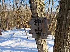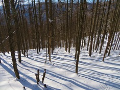 左の耳からは北に進むのだが、僅かに東にオフセットするような尾根で、その榊山は最高所に三角点は無く、やや北に降りた場所に埋められ、そこで榊山としていた。古い山名板があり、その上に反射板が打たれていた。よくある反射板は電波反射板で大型構造物であるが、ここでは自転車の反射板のようであった。踵を返し自分のトレースを追って戻る。東側には次に目指す小唐沢山が双耳峰で見えている。左の耳からの南斜面は、刃物跡が多く見られる緩斜面であった。東に降りる尾根に乗り1210mの高みで進路を間違えてしまう。