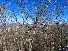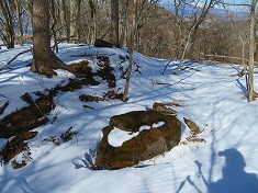 尾根が目の前にあるが、そのまま林道を追う。林道の南側には小屋も見られ、一部南西側が開けた場所があり八ヶ岳連峰の全てが見える場所があった。この先もススキが繁茂した場所があり、この辺りで採石場らしい岩肌が現れる。重機も置かれ砕石した板状の鉄平石が積まれ置かれている場所がケルンのように雪の中に見えていた。尾根に乗りたいが北側は岩肌で登れない。登山靴なら登れるが、スノーシューの足なので登れないと言うのが正解。そのまま東に進むと、こちらにも藪の中に小屋があった。ここには地形図からは道形があるようであるが、雪に隠されているのか見えてこなかった。北東に斜上するように藪斜面を上がって行く。やや伝い辛い場所で、アプローチの仕方が悪かったか・・・と思いつつ登っていた。