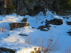 横見山の南斜面は、やはり深く登り辛かった。そして横見山の西側鞍部に乗ったら、そのまま西に進んでみる。1330m峰には「PTEC」「Drヘリ 027−224−7999」と書いたテプラが巻かれていた。採石場のもしもの場合のためか。作業現場ではだめで、ここに登らないと携帯が通じないのかもしれない。さらに西に行くと南側が拓け採石場を見下ろせる場所に出る。尾根上は鉄平石の岩盤で、削られているので東西に細い。場所を選ばないと進めなくなるので、植生のある場所を伝うように進んで行く。それでも西側の肩まで行くとどこを降りるにも急峻になる。そこに鉄平石の板状の石がいくつも落ちているので、雪の下のそれらにスノーシューの刃が当たり、ギーギー軋むのと、それがために滑って歩き辛い。ここでも上側を向いてバックステップで下った。