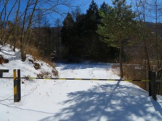 | @余地峠への林道ゲートまで除雪され、余地ダムの駐車場も除雪されていた。 | A除雪の様子と林道入口。ここからスノーシュー。 | A林道を含め私有地のよう。 | 採石場手前にもゲートがある。 |