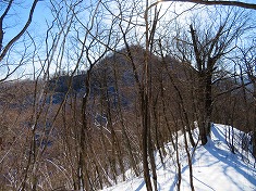 尾根は一応あるが、雪が付いておらず、ある場所は凍っていた。さすがのMSRのスノーシューも場違いになり、途中でデポする。アイゼンにスイッチしたかったが、持ってきたのは軽アイゼン。ここがこれまでとは予想できていなかった。想像力がまだまだ乏しいとも言える。木々に掴まりながら這い上がって行く。下りはザイルを流したいような、そんな足場ののっぺりとした場所が続き、登山靴のコバが引っ掛からないような場所が続く。それでも何とか登れており山頂に近づいている。振り返ると右の耳や、もう遠くに横見山が見えていた。