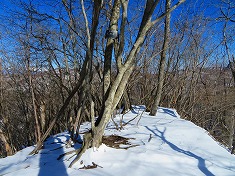 | 右の耳の西側は信州側も上州側も切れ落ちている狭いリッジ。一番狭い場所で200mmほどしかなかった(冬季)。 | F右の耳から見る小唐沢山。ここから見ると、急過ぎて登れそうに見えない。 | 小唐沢山の西尾根は、急峻で雪も付かない。冬季はアイゼンが必要。 | G小唐沢山。凸頂で360度の展望がある(木々の間からも含む)。 |