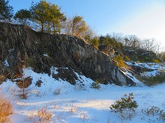 | 林道下に作業小屋 | B林道入口付近もススキが繁茂し、採石場内もこの通り。しばらく往来の無い林道のよう。 | B採石場の様子。採石場内を進むより、西側から尾根に乗ってしまった方が楽だと思う。 | B鉄平石を積んだ場所が残る。 |