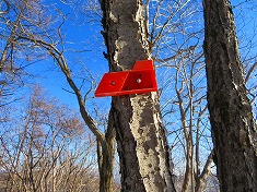 1239高点の北東、1220mの屈曲点で初めて道標に出合う。「海から一番遠い地点」と「榊山」の方角を示していた。忠実に東の1230m峰に乗り上げてから北に向かってゆく。マーキングはこのピークの北西斜面を通過していた。北に進むと、右前方に高みが見えだす。ここが1270mの左の耳で、その最高所にはマーキングが乱打されていた。この先の榊山は帰りにとも思ったが、小唐沢山の帰りは左の耳をショートカットする判断もできる事から、先に榊山を踏んでおくことにした。