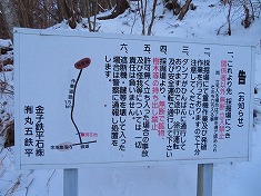 6:29ダムを出発する。ショートスキーかスノーシューか迷ったが、汎用性の高いスノーシューを持つことにし、ここからは手に持って出発。すぐ先にある枝林道入口で足に装着する。ゲートのところには絵図を添えて注意書きがあり、向かう先に鉄平石の採掘場があることが判る。沈み込み量は100mmくらい。快適に登って行ける。しかし入ってすぐにススキのブッシュがあることから、利用していない林道と判断できた。林道の上の方の九十九折は、大きい九十九の場所はショートカットするような道が存在し北に進むことが出来た。ここには壊れたバスが置かれており、その北側にはゲートが存在していた。