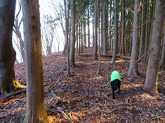 熊倉山には、かかり木を処理した後なのか、三角点の西側の木には刃物痕の残る丸太が挟まっていた。ここにはすかいさん関の標識が結わえられていた。三等点は植林された木の根元近くに埋設されていた。実際は木の方が後に植えられたのだろう。もう少し距離を置いて植林した方が良かったような・・・。南は針葉樹の植林帯、北は広葉樹帯で葉が落ちているので、その間からなんとか遠望を楽しめた。東の亀穴峠側にも興味があるが、今日はここまで。14時に高崎市で約束があり遅れぬよう戻らねばならない。河内晩柑で喉を潤し往路を戻る。としたかったが、東側の道を伝っておらず東寄りに降りてゆく。