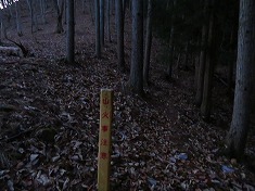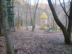 | A出来て新しいアスレチック場。 | アスレチック場の東に墓石があり、その南に巡視路が始まっている。 | 谷の中へと入って行く。 | 新しい道標が見られる。 |