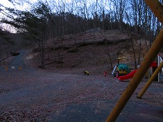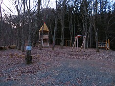 | @しおじの湯の駐車場に置いて出発。(オープン前に出る計画) | @しおじの湯の南にこの道標がある。 | 「木森れ陽」の施設。 | 下側の遊具の場所。道が分かれるがどちらを選んでもいい。 |