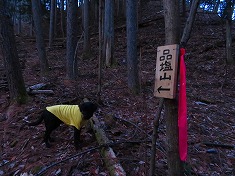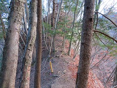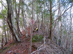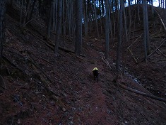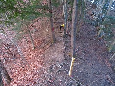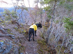 コルを経て南に進んで行く。その先は少しやせ尾根で、この付近から中ノ沢地区で飼われている犬がこちらを気づいたようだった。猟犬が飼われているのだろう、3頭〜4頭ほどが吠え立てていた。いつもながら猟犬の察知力の凄さを感じる。相棒が鈴を鳴らして歩いているせいもあっただろう。