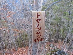トヤノツムジ到着。まだ新しいがいい雰囲気の山名板が取り付けられていた。ここの三角点は無傷で三等と読めた。迷犬は不完全燃焼のようで南に進みたがるが、今日はここまで。ヤキソバパンを分かち合う。そして気になっていた尾根を眺める。尾根の様子も植生もインプットできた。下山開始。