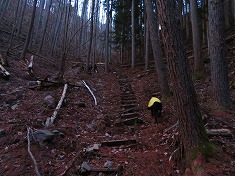 早い人ならだれか上がってくるかと思っていたが、推奨が下山路使用だからか、先の方を目で追っても人の気配は無かった。アスレチック施設は温泉と抱き合わせにした家族連れ誘致の目的でもあろう。木森れ陽の上側には真新しいトイレもあり、当然アスレチック利用者の為だろうけど、起点に温泉を擁し、ここを上野村のメインの登山コースにしようとしているのかも、とまで想像するのだった。