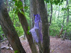 | 1060m付近にもマーキングがあった。 | E1042高点帰り | 900m付近から北東。尾根が分かれるので注意。 | これはシカの仕業か。細く彫れた傷が見られる。 |