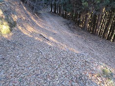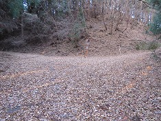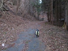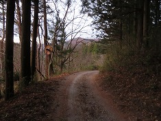 | 575m付近。最上部のお宅への入口がある。 | B580m付近の分岐。地形図のカーブの場所だが、現在は谷側への道が存在する。 | カーブの上側斜面に古い社あり。 | 670m付近。ここが実線路の終点地。破線路は左上の地形にあるが、取付き路は消失していた。 |