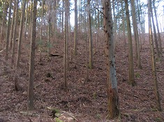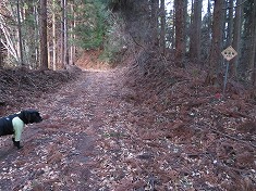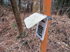 | C南東から | 南東尾根を下ると二本の林道が下に見え、その分岐が北東側にある。 | 往路は写真左側に入った。 | 林道沿いのカーブミラーのほとんどで、この注意看板が折られていた。 |