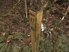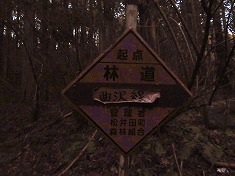 | @林道途中にあるすれ違い余地の570m地点から出発。 | A586高点分岐 | A実線路の方は、林道曲沢線 | A上部に鉄塔があるので巡視路道標が立つ。 |