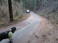 国道18号を伝い横川辺りは2℃だった。それが、久しぶりに旧道に入り霧積エリアに入って行くと、下がるのではなく上がり5℃を示した。以前にも南砂坂三等点の時にこのことを書いているが、偶然ではなくそんな地形のよう。横川地区より、坂本地区よりも霧積地区の方が暖かい。北風や西風が入らない場所だからだろうか・・・。水谷地区に入り目的の林道分岐点余地に着いたものの、そこには大量のソーラーパネルの物資が置かれていた。これでは停められない。作業が進行形のようだった。伝いたい林道に入って行く。586高点の分岐には林道曲沢線と看板があり林道名が判った。進んで行くと、地形図上の折り返しカーブのところにも物資が在った。てっきり水谷川右俣側で設置がされていると思ったが、どうも南側のゴルフ場に設置していると予想できた。経路が工事に使われている・・・。来た道を戻り、586高点東のすれ違い余地に停めた。工事車両が入ることを思うと、ここくらいしかなかった。