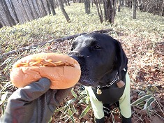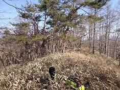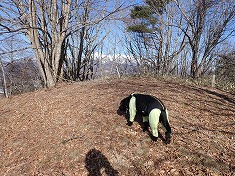 細長い山頂部で、南側には下草の無い肩部があり、その北側に二ノ窪三等点が埋設してあった。この場所にして、二つの角が割られていた。人工物はこの標石のみで、マーキングの類も付近に見られない。木々の間から八ヶ岳を望めるが、展望が良いとは言えず、登山対象の場所にならないる理由も判る。本日予定の高い方のピークなので、ここでヤキソバパンを出して迷犬と分かち合う。さて次。