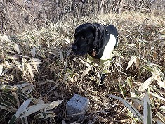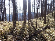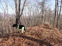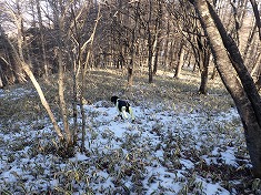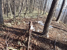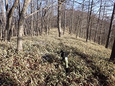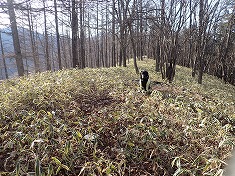 北に降りて行くのだが、やや笹の植生が濃くなった印象だった。1540m付近まで下ると、有刺鉄線が張られた支柱が並びだした。もうほとんどが千切れてしまっているが、迷犬はその存在が見えていないようで引っかかりはしないかとハラハラする。この先の1550m峰は休憩適地で下草なし。おまけに周囲展望が良い。木々はあるのだが樹林間隔が広い場所だった。北に進み、次の1500m峰を越えると、屈曲峰になる1510m峰がある。これまでの進路からは北尾根を進みたくなるが、育成四等点峰は北西尾根上にある。ここからの北西への斜面は広く、やや進路方角に戸惑う。視界が得られない時は注意する場所となる、ここは北西に進むと言うより、思い切って真西に下った方が続く尾根が分かり易いと思えた。北西尾根には、その東側斜面に鹿道が見られ、そこを追って進む。