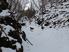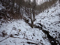 | 山手からの、大量の土砂の押出がある | C1450mの林道カーブの場所から、沢沿いの破線路に入る。この手前の谷から西に上がってもいい。 | 1500m付近で右岸の道は沢沿いから離れる。そのまま沢を詰める。 | 1550m付近。雪の詰まった沢を伝う。足の下からは流れの音がしている。 |