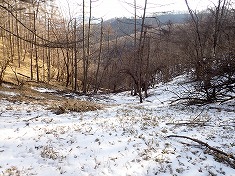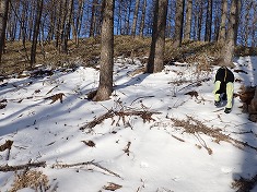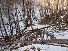旧キャンプ場から歩くこと2分ほどの場所で、西側斜面から広く土砂の押出があった。この辺りから林道上に雪が乗るようになる。標高1420mに谷があり、破線路を伝わずに、ここを入ってもいいようだった。なんとなく道形もあるように見えた。破線路の様子を確認したかったので先に進み、1450mの所から林道を離れ谷に入る。沢の右岸に薄い道形がある。地形図の破線の場所は谷の中ではなく、もっと東側に描かれており、伝っている道形は破線路とは違うようだった。1500m付近で、この右岸の道は鋭角に折れて北東に上がっていっていた。東を見上げると、その道の先だろう場所が見えていた。ここからは沢の中を進んでゆく。両岸からの雪の堆積があり、よく締まっているので歩きやすい。その下からは流れの音がしていた。踏み抜いて水没しないよう、少しドキドキしながら足を降ろして行く。