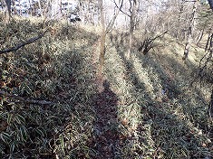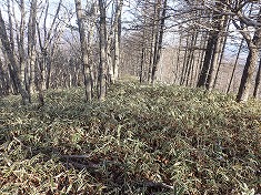 谷地形が西に向く場所で、そこからは谷歩きがし辛くなり、谷に対しての左岸である地形を這い上がって行く。登って行くと1580m付近で道形に乗る。これは地形図に見える、西進している道が北進になる、この辺りで間違いなかった。林道は高度を上げて行くので伝いたくもなったが、ここは林道を跨ぎ西進してゆく。残雪が切れると笹の植生が出てくるが、負担にならない程度の膝丈の植生だった。