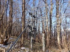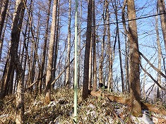 1590m峰に上がると、ミントグリーンの人工的な色が目に入った。それは支柱で、そこにケーブルが渡っていた。東に支柱を追ってゆくと、大ぶりなアンテナ設備が見られた。これは間違いなくシャトレーゼホテルの受信設備だろう。脚立までが置かれていた。このアンテナの場所から北進に変わる。緩く下り、同じほど登り返すと、最初の目的峰だった。