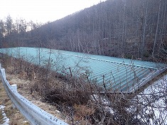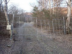 | 大きな鮮やかな貯水施設。敷地内は駐車し辛く、すぐ南の路肩余地に停める。 | @貯水施設南の1320m付近からスタート | 畑の南端。農地用の簡易トイレ在り。 | Aゲートはあるが、紐で縛られているだけで、誰でも開閉できる。注意文言もない。 |