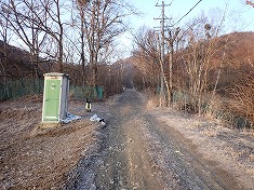 5:48行動開始。南に進むと畑の南端の場所に仮設トイレが置かれていた。一帯にはあちこちにこれらが見られる。畑ならどこでも・・・と思いたいが、外国人などを使う場合はそうはいかないのだろう。この場所から既に向かう先にゲートがあるのが見えていた。施錠されていたら万事休す。そのゲートまで進み観音開きの中央部分を見る。固定にはクレモナロープを使い、それで縛っているだけであった。あと、よく見る川上村としての注意書きがない。普通なら立入禁止とかの抑制される表示があるのだが、珍しいことにこの林道にはそれらが無かった。紐を解いてゲートを抜ける。この先3分で、1343高点の場所となり、東側に地形図に描かれる道が見えていた。