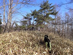 | G1495m鞍部帰り。ここから東への尾根を使う。 | 尾根上1420m付近。やや灌木が増える。 | 尾根から離れ南へ下る。1395m付近。深い場所で腰丈ほどの笹の植生。 | Hゲート帰り |