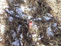 1626高点到着。スキー場頂上から見下ろすとゲレンデには雪が続いていたが、リフト降り場を覆っていた雪はもう溶けてしまっていた。ゲレンデが西側にあるので遮るものが無く、その先にある八ヶ岳がきれいに見えていた。ここから北西に尾根を進んでゆく。1600m付近には小さな池が存在した。これは残雪気限定の池かもしれない。尾根上にはプラスチックの赤い杭が続いていた。その頭を悉くシカが齧った痕があった。