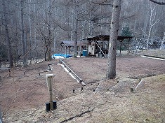 | B1343高点。東からの道形が合流する。 | 屋根の低い大きな施設。 | 旧のべやまキャンプ場。林道を挟んでキャンプサイトがあり、沢の右岸側にも見られる。 | キャンプ場のところにもゲートがあるが、バーは取り払われ鍵はこの通り。 |