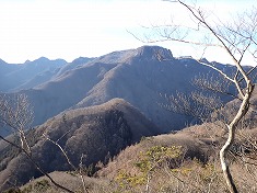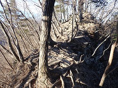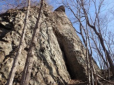 岩穴は、下から見上げ想像したのとは異なり、奥行きの浅い窪みがあるだけだった。ここからは岩斜面を東から巻き上げて行く。西に本渓が見える場所になるが、上流側に長く凍っていた。凍っていなかったら、伝うのにちょうどいい渓のつくりではあった。高度を稼いでゆくと、800m付近の東側に巨岩頭がスクンと立っていた。そこを目指して這い上がって行く。途中には、とても目立つ塊根植物のような奇形の木が見られた。岩頭の上はそこそこ展望が得られた。