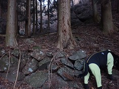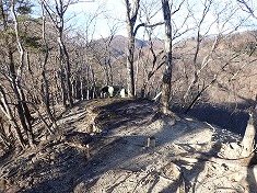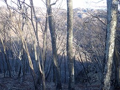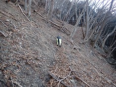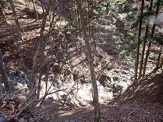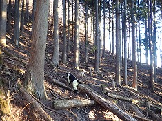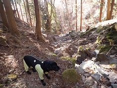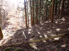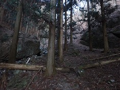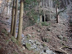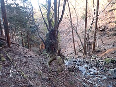 | 凍った場所を巻き、本渓に戻った場所に奇形の木が目立つ。上から見降ろしている。 | 850m付近。植林斜面を上がる。 | 865m付近に炭焼き窯跡 | 940m付近。薄い道形あり。鹿が多いようで、シカ道かも。 |
