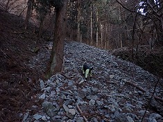 | 700m付近のガラ場。西からの崩落による押し出し。 | 730m付近の石積み。これは植林目的のよう。 | 735m付近に大岩が左右に現れる。 | 765m付近で、右岸に道形が残る。 |